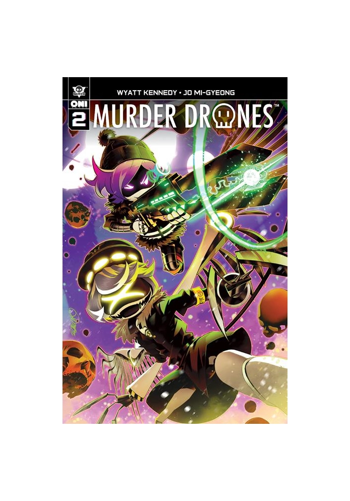 ROBOTS! REBELLION! AND THIS SICK-AS-HELL RAILGUN! From Glitch Productions and Oni Press, the record-shattering adaptation of the groundbreaking animated series from writer Wyatt Kennedy (Nights, Wiccan: Witches’ Road) and Jo Mi-Gyeong (Eve) continues! Following the annihilation of the human colonists once tasked with gutting its resources in order to maximize shareholder value, the remote exoplanet of Copper 9 stands in ruin. But, beneath the surface, the colonists’ robotic worker drones have built a new kind of life for themselves with purpose, schools, doors, and card games! Now, teenage drone Uzi has made an unlikely bestie in Disassembly Drone N, whose primary purpose, until very recently, was to destroy the worker drones (for reasons). But it’s not just prom dates and awkward silences for these two wacky kids. A mysterious force continues to stalk the drone population from within, leaving a bloody trail of bodies in its wake. It’s a real drag!